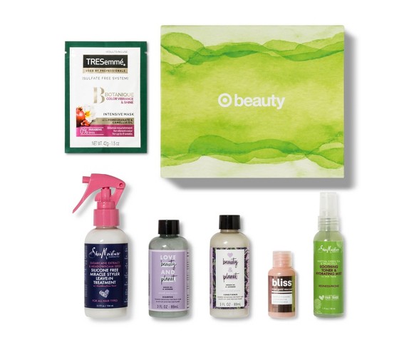 Description MARCH INTO SPRINGIf you spent your winter hibernating and sipping hot cocoa, you’re not alone (No shame in our game!). But now that the days are getting longer and the weather’s getting warmer, it’s time to get glowing—stat. To the rescue, our box of beauty finds that’ll help you march into spring more radiant than ever.Try ‘em out, and if you love them as much as we do, find the full-size versions at desercart.ae/BeautyBox.Like what you tried? We want to see what you got, what you loved and how you styled it. Tag us with #TargetBeauty or #TargetBeautyBox.WHAT"S INCLUDEDBliss Rose Gold Rescue Gentle Foaming CleanserRose water extract acts as a natural astringent, gently removing excess oil and grime, while rose gold shimmer gives skin a subtle glow.Love Beauty & Planet Smooth and Serene Argan Oil & Lavender ShampooRich blend of golden argan oil and French lavender leave locks smelling fresh and help keep strands frizz-free.Love Beauty & Planet Smooth and Serene Argan Oil & Lavender ConditionerAnti-frizz formula infused with golden argan oil and French lavender smooths strands and nourishes hairfor healthy-looking locks.TRESemme Botanique Nourish & Replenish MaskBotanical blend of pomegranate and camellia oil gives strands a surge of intense hydration, leaving locks soft.SheaMoisture Matcha Green Tea & Probiotics Soothing Toner & Hydrating MistAntioxidants and matcha green tea help hydrate and soothe redness, while nourishing probiotics restore balance to the skin to fight future flare-ups.SheaMoisture Silicone Free Miracle Styler Leave-In TreatmentInnovative blend of sugarcane and nourishing botanicals leave tresses tangle-free, so strands are manageable and luxurious.Number of Pieces: 6Features 6 nourishing beauty itemsOver an $18 valueGet fresh with Spring BeautyGreat way to sample new items, or stock up on travel sizes Estimated shipping dimensions: 4.0INCH X 1.5INCH X 6.0INCH DPCI : 037-07-0047 UPC : 490370700479 TCIN : 54457287 Estimated shippimg weight: 0.9POUND