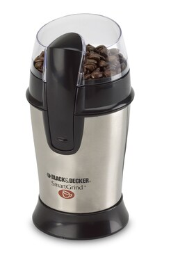 Description Black & Decker® 4 oz Smart grind coffee bean grinder in silver color is made of durable stainless steel construction with built-in cord storage that preserves flavor of fresh ground coffee. Black & Decker® 4 oz Smart grind coffee bean grinder in silver color features stainless steel bowl and lid lock for security. Grinder has push-button pulse control for comfort and is ideal for grinding coffee/nuts/spices. Stainless steel grinding blades and bowl Capacity: 4 oz. 8 1/2"(H) x 4 1/4"(W) x 4 1/4"(D) Silver Lid locking security feature for safety Voltage: 120 V, watts: 130 W, motor: 120 W Category: Coffee grinder Easy touch pulse control quickly custom grinds your favorite coffee beans from coarse to fine, sneak-a-cup technology Precision stainless steel blades for even grinding and consistent performance Great for coffee beans and nuts, built-in cord storage, only operates with the lid in place for safety Contemporary design for today's kitchen, push button pulse control helps you precisely grind coffee beans Warranty: 2 years limited Specifications Watts : 120 Color Family : Gray/Silver True Color : Gray/Silver Coffee Grinder Capacity (Ounces) : 4 Coffee Grinder Type : Blade Brand : Applica Customizable : No Weight : 1.75 lbs. per Each