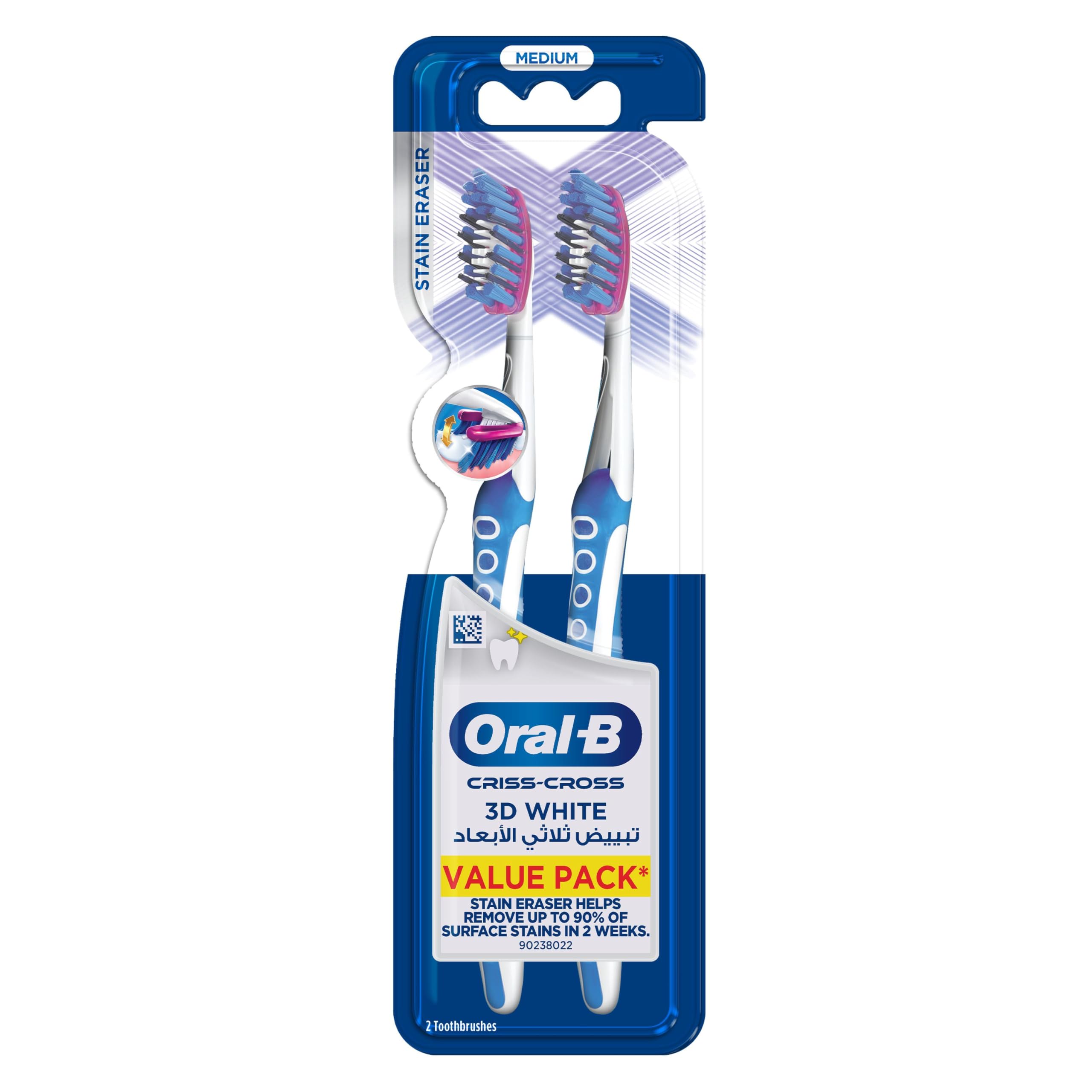 The Oral-B 3D White Luxe Pro-Flex Medium Manual Toothbrush features a dual-flexing head and a unique stain eraser that removes up to 90% of surface stains in 2 weeks. Designed with medium nylon bristles, it offers a gentle yet effective clean tailored to the contours of your teeth and gums. Trusted globally and made with recyclable materials, this pack of 2 manual toothbrushes combines expert dental care with eco-conscious design.