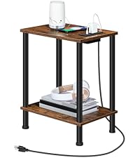 The HOOBRO End Table is a compact, rustic-industrial nightstand designed for small spaces, featuring a built-in charging station with 2 USB ports and 2 power outlets. It offers versatile storage with 2 drawers and 2 open shelves, crafted from durable particleboard and metal with adjustable feet for stability and floor protection. Perfect for modern living rooms, bedrooms, or home offices, it combines functionality and style with easy assembly.