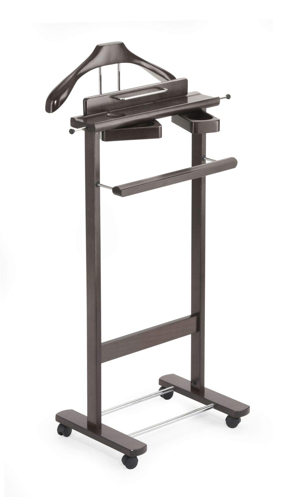 The Aris Galant Luxury Valet Stand is a beautifully crafted piece made from solid beech wood with a stunning wenge finish. Designed for functionality and style, it features an anti-skid pant bar, two drawers, two tie/belt hooks, and a convenient tray for coins. With dimensions of 44x33x101 cm and a lightweight design of just 3.6 kg, this free-standing valet stand is perfect for any modern home. Enjoy free shipping (customs fees not included) and embrace the sophistication of Italian craftsmanship.