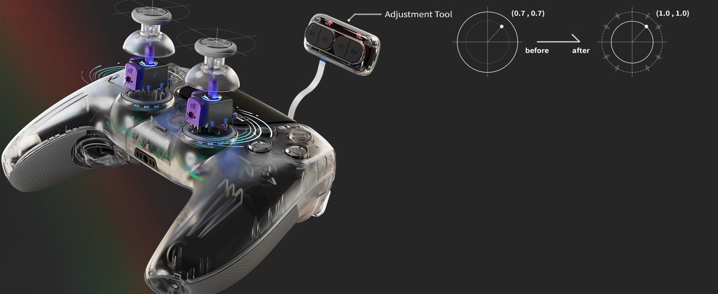 The HEXGAMING PHANTOM Pro Controller is a premium, ergonomically designed gaming controller compatible with PS5, PC, and mobile. Featuring 4 remappable back buttons, 6 swappable profiles, 8 interchangeable analog sticks, and adjustable digital/adaptive triggers, it offers unparalleled customization and precision. Its advanced Hall effect joysticks provide long-lasting durability and accuracy, while soft rubber grips and adjustable calibration enhance comfort for extended gaming sessions.