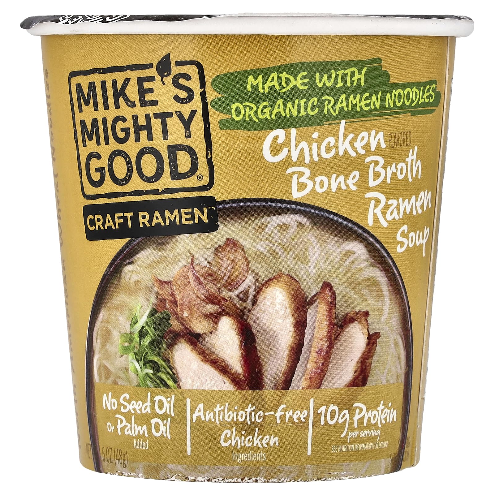 Mike's Mighty Good Ramen Soup, Chicken flavor, is a premium instant ramen cup featuring organic steamed noodles made in-house, a rich and decadent broth, and 40% less sodium per ounce than leading ramen brands. Ready in minutes, it offers a gourmet ramen experience with clean ingredients, perfect for busy professionals seeking a quick, healthy, and customizable meal option.