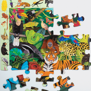 The Rainforest Search & Find Puzzle is a 64-piece cardboard puzzle designed for children ages 4 and up. Measuring 23” x 15.5”, it features colorful artwork of rainforest animals, plants, and insects. After assembly, kids can enhance their observation skills by finding over 40 hidden creatures within the puzzle image. This award-winning educational toy encourages patience and curiosity, packaged in a convenient storage box.