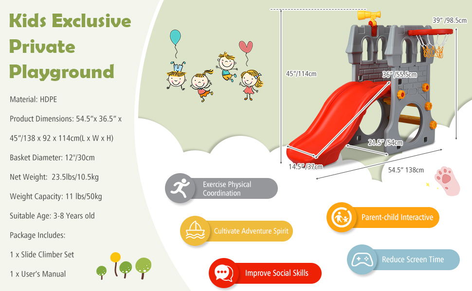 KOTEK Toddler Slide Indoor for Age 3-8, 5 in 1 Kids Climber Slide with Basketball Hoop, Telescope, Crawl Through Space & Climbing Stairs, Freestanding Kids Slide for Boys & Girls