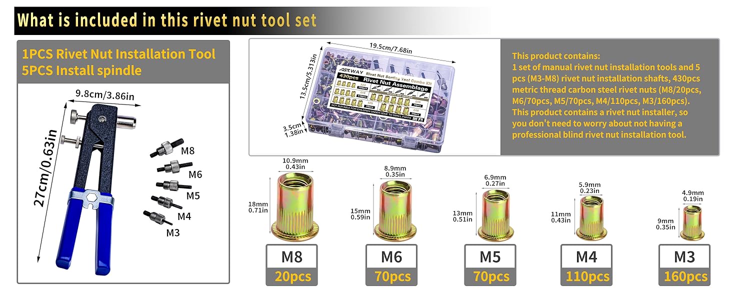 The AskWay Pressure Rivet Nut Tool Kit offers 430 galvanized carbon steel rivet nuts in 5 metric sizes (M3-M8) paired with a sturdy manual pressure tool. Ideal for professionals and DIYers alike, it ensures rust-resistant, slip-free installation across furniture, automotive, marine, and industrial projects. Packaged in a clear, labeled storage box for ultimate organization and portability.